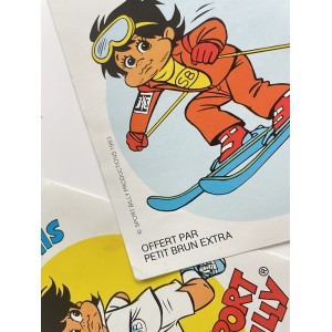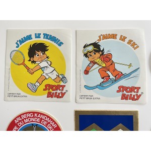- 2 autocollants Sport Billy de 1983 - Offert par PETIT BRUN EXTRA. "J'aime le Tennis" "J'aime le Ski". Dim. 11 x 12 cm.