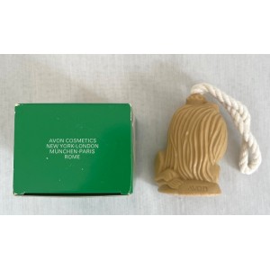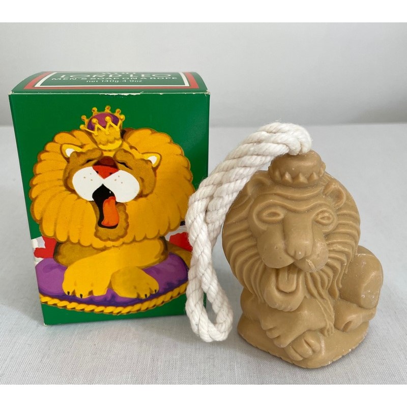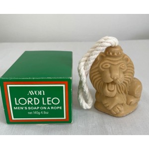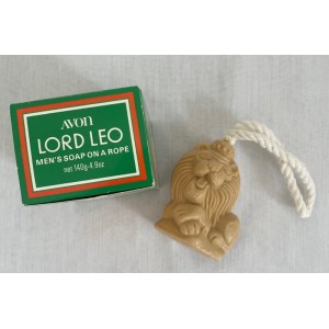 Savon parfumé de marque Avon, forme lion, coloris ocre. Savon à accrocher, cordelette de coloris blanc. Boite en carton d'origine colorée avec illustrations et logo sur 5 faces.