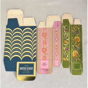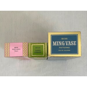 - 1 boite AVON - Eau de Cologne "Ming Vase" en carton décoré bleu, blanc et doré sur les 4 faces avec Marque et nom eau de Cologne sur le dessus de la boite. Dimensions (boite montée) : H 16 x 8 cm. Profondeur : 6 cm.