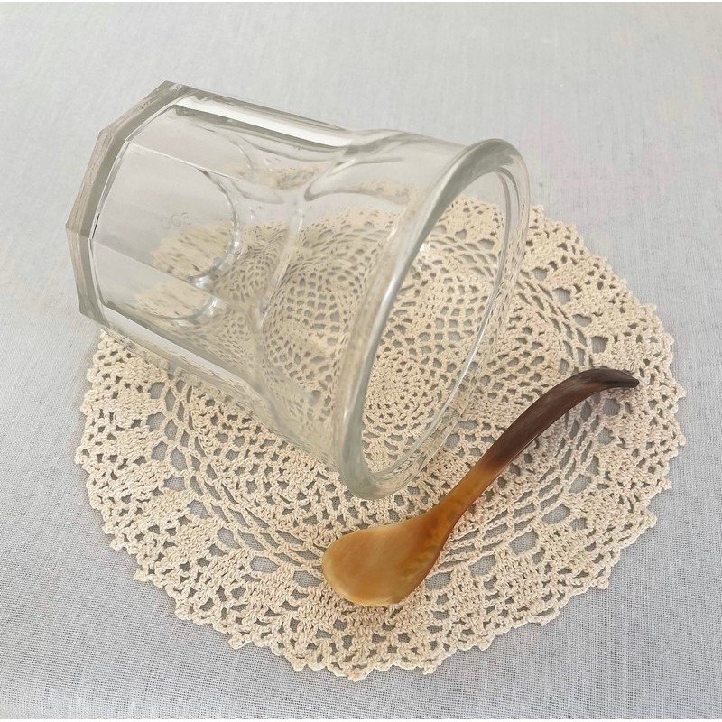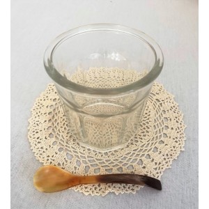 Lot petit déj' comprenant un Pot à confiture ancien avec une Cuillère en corne de buffle et un Napperon en crochet ancien