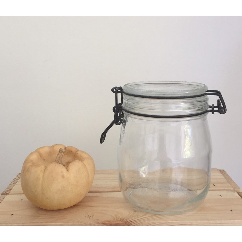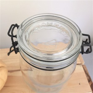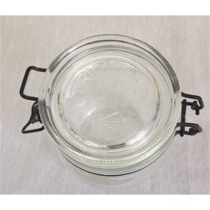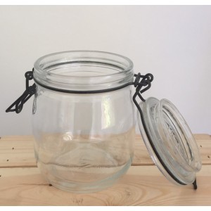 Bocal en verre translucide avec couvercle à fermeture en métal.