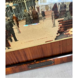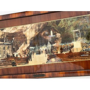 Grand cadre rectangulaire en bois avec photo chromo colorisée représentant la Grotte - Lourdes protégée sous verre. Plaque en métal "Souvenir de Lourdes".