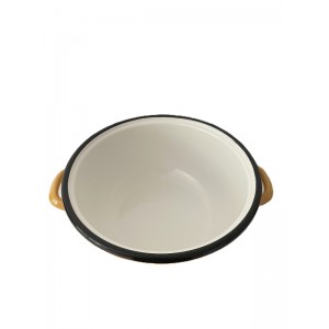 Grand plat avec deux poignées en métal émaillé jaune à bordure noire, intérieur blanc.