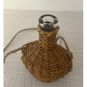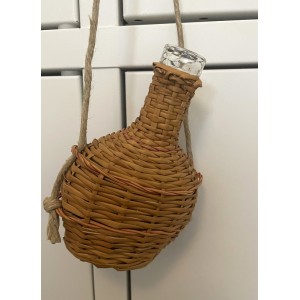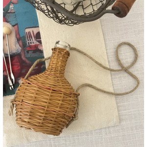 Petite bouteille, gourde en verre translucide blanc recouvert d'osier naturel.