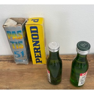 Lot de 2 mini bouteilles d'alcool en verre de marque PERNOD 45. Bouteilles pleines.