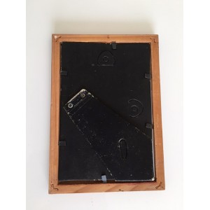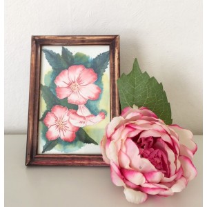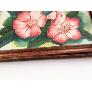 Petit cadre en bois patiné à accrocher ou à poser avec illustration de fleurs roses sur feuillage sous verre.