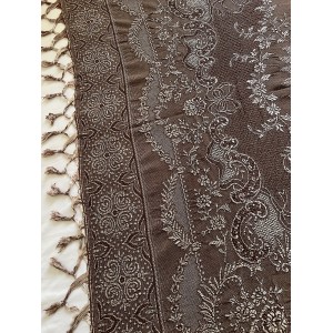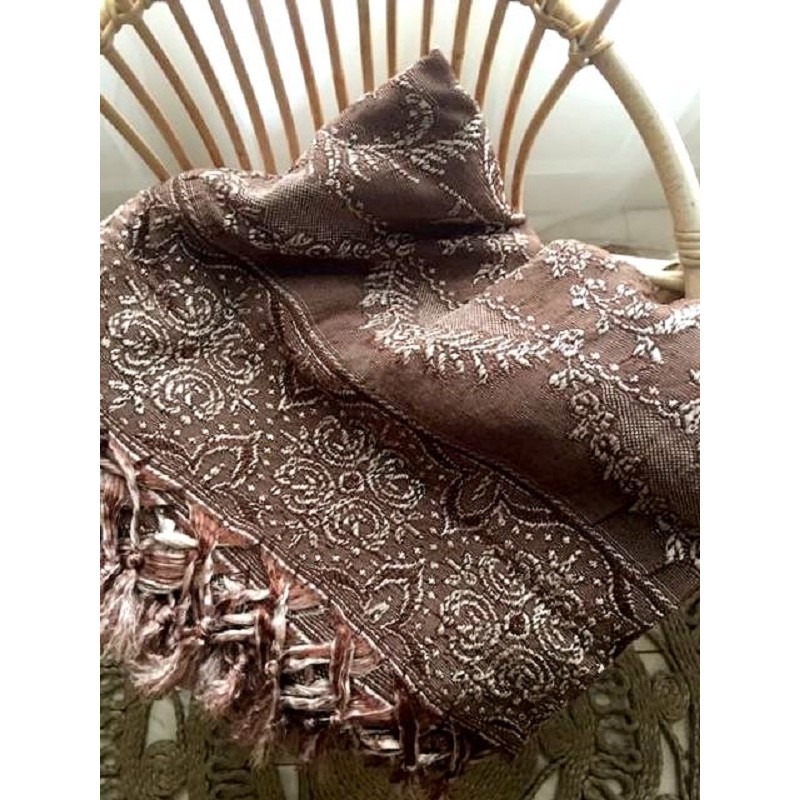 Grand plaid esprit bohème en fil de soie avec franges. Trois tons de marron, Vintage ancien années 40/50