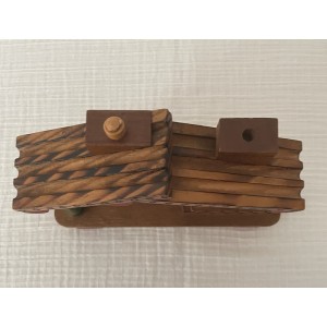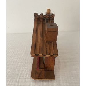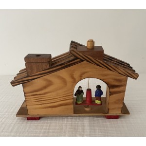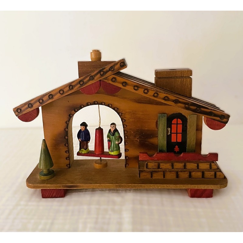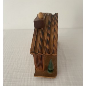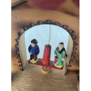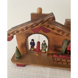 Baromètre chalet en bois peint et verni. Chalet avec deux personnages en bois peint qui indiquent la météo grâce au fil en boyau qui réagit aux changements d'humidité de l'air. Quelques décors en bois en relief, une fenêtre, un parapet, un sapin.