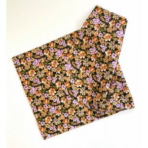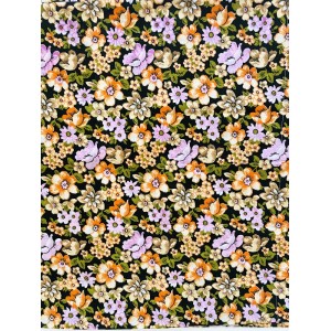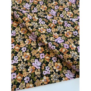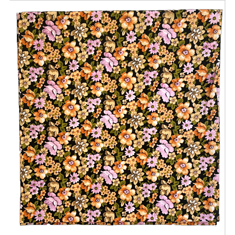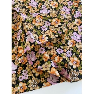 Taie en 50% coton et 50% polyester à motifs de fleurs colorées : orange, marron, beige, blanc, rose et vert sur fond noir.
