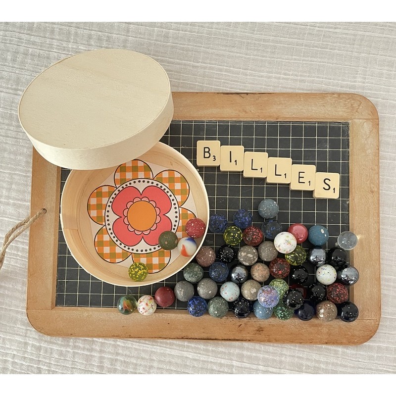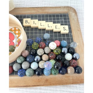 ÉTAT : Billes vintage avec usures d'usage : Billes en terre avec patine et usure d'utilisation. Boite neuve avec papier vintage.