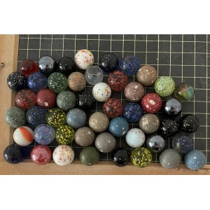 Lot de 50 billes : 34 en verre à motifs et coloris différents. 16 en terre à coloris différents.