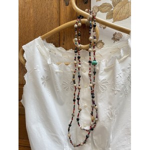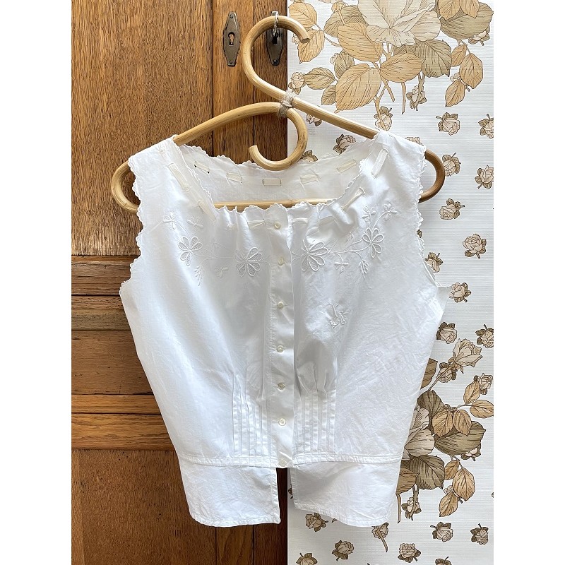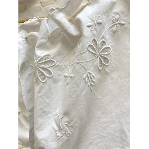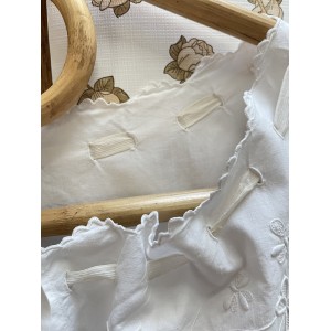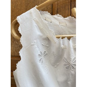 Broderies blanches sur col, décolleté, emmanchures et sur l'avant. Ruban lacet à resserrer sur le décolleté. Un monogramme sur la poitrine.