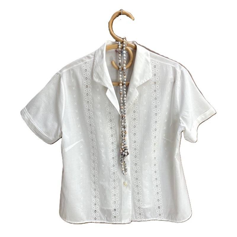 Chemisier à manches courtes à boutonnage (4 boutons anciens) en coton léger blanc avec des broderies blanches.