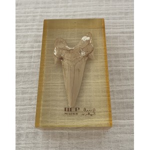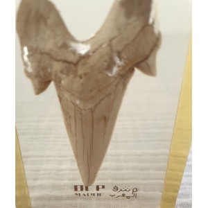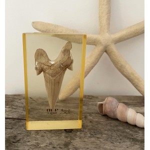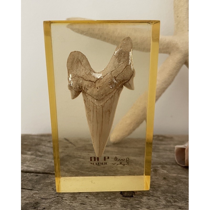 Statuette en résine avec inclusion d'une dent de requin. Résine estampillée OCP Maroc.