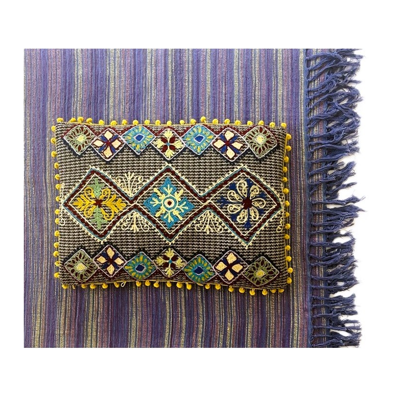 - 1 coussin rectangulaire de marque La Fiancée du Mékong (ancienne collection). Coussin avec tissu aspect lainage brodé de motifs floraux, de frises. Finition avec pompons en bordure. Dos en coton coloris noir.