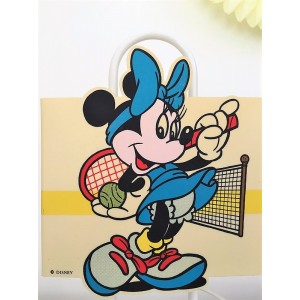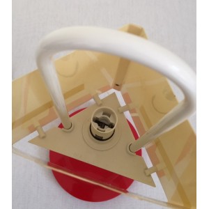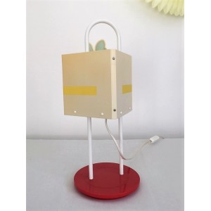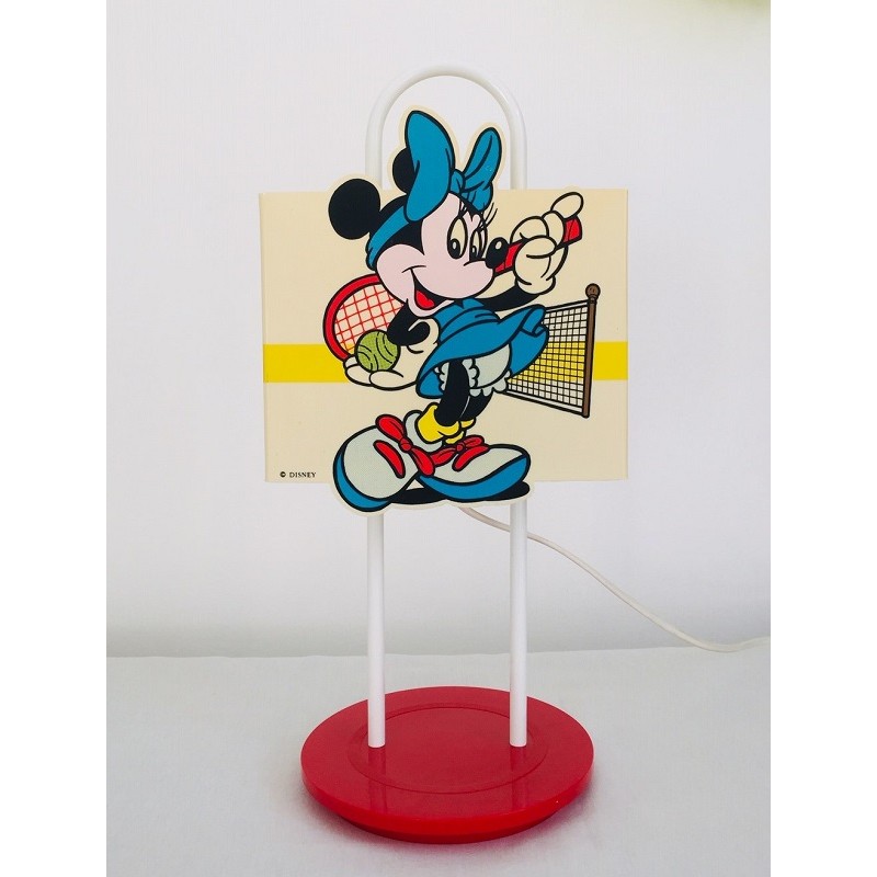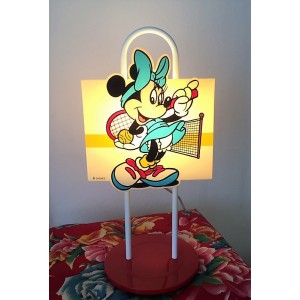 Lampe en plastique ABS avec abat jour blanc cassé illustré avec Minnie. Socle de la lampe rouge. Pied forme poignée.