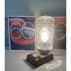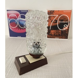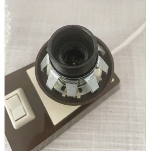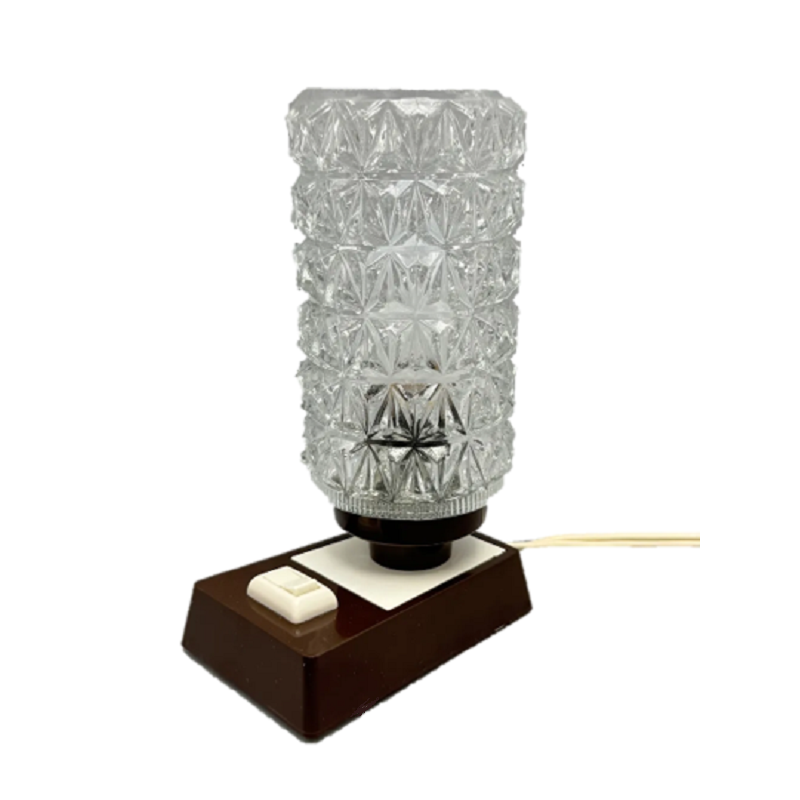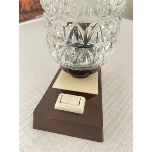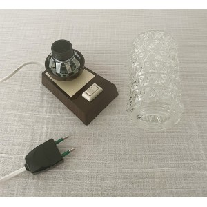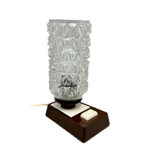 Petite lampe de chevet, de table. Base en plastique robuste marron et beige avec un abat-jour en verre à la forme travaillée. Joli jeu de lumière et de reflets lorsqu’elle est allumée. Bouton poussoir sur la base-socle de la lampe.