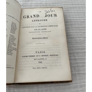 - Lettres de la première communion, Le grand jour approche de 1866. Reliure cuir beige (textes en N&B). 250 pages. État : Couverture en bon état général, teinte beige fanée pour le cuir. Intérieur correct, quelques rousseurs, papier jauni. Dim. 14,5 x 9 cm. Prof : 2 cm.