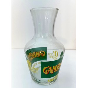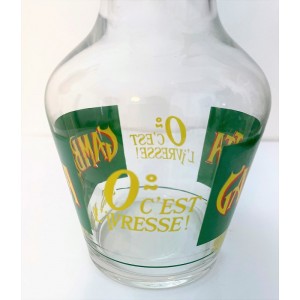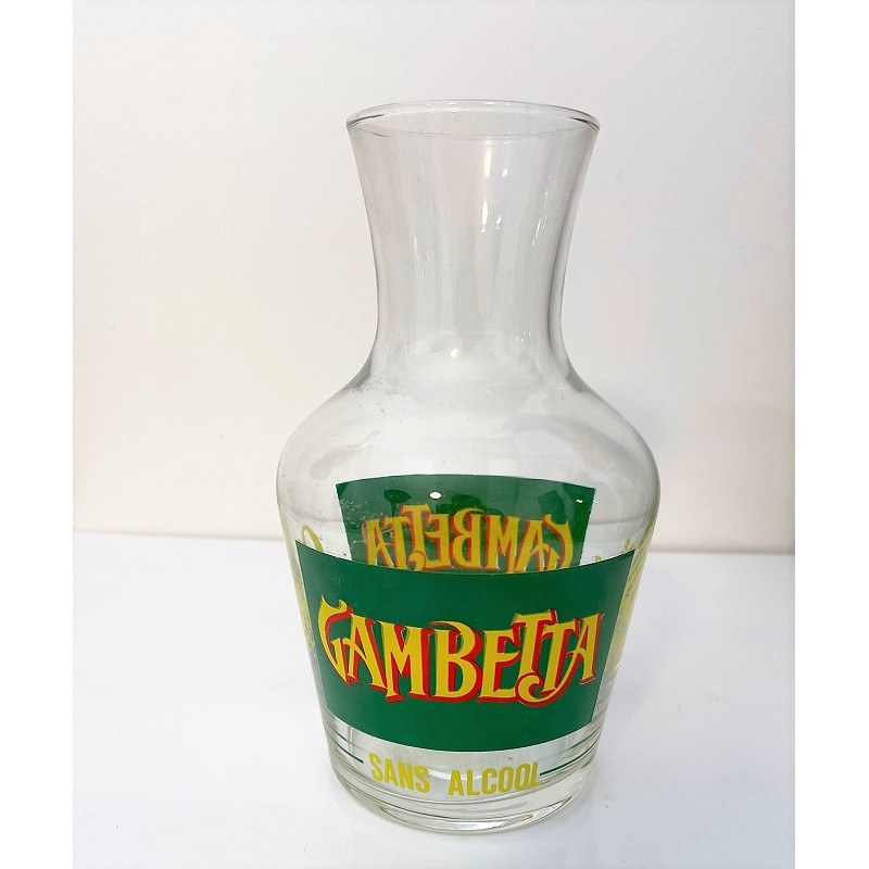 Carafe en verre incolore avec logo, inscriptions coloris vert, jaune et rouge : GAMBETTA sans alcool 0% c'est l'ivresse sur le pourtour de la carafe.