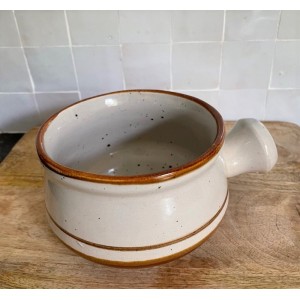 Coupelle à poignée, Bol forme Caquelon en grès émaillé de coloris beige minéral légèrement moucheté intérieur et extérieur avec lignes 2 tons de marron.