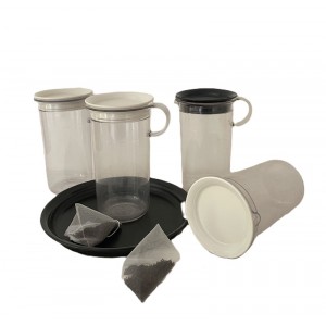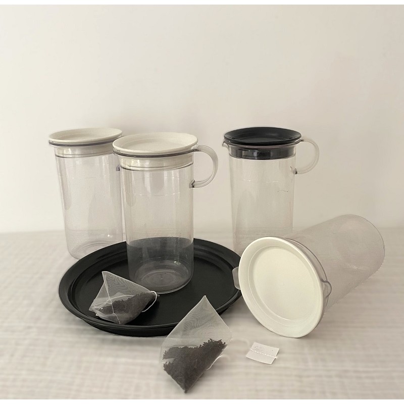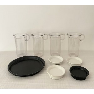 4 boites forme pichet verseur de coloris transparent avec couvercle blanc (3) et couvercle noir (1). Dimensions : Diam. : 8 cm. Hauteur : 14 cm.
