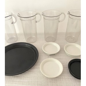 Lot Tupperware comprenant : 4 Bocaux, Récipients à bec avec couvercles blancs et noirs et 1 plateau rond noir en plastique mat et transparent rigide.