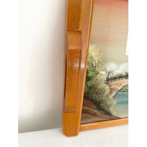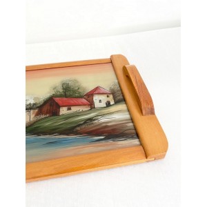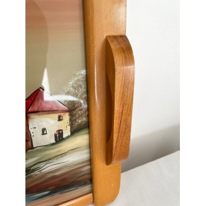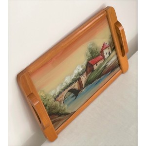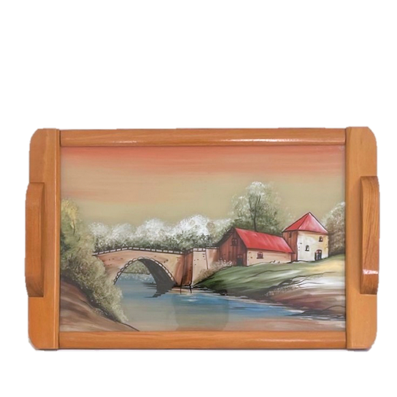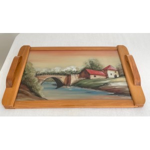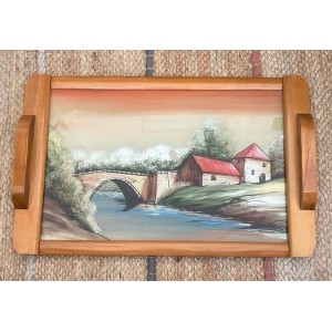 Plateau de service vintage en bois design à décor peint d'une maison et d'un pont au bord de l'eau de style DOPE