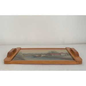 Joli plateau à poignée en bois design de couleur clair et vernis à décor peint à la main sous plaque plastifiée aspect verre.