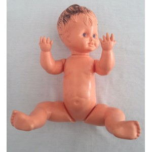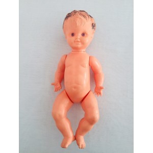 Poupon en plastique moulé. Bras et jambes articulés (articulations emboîtées). Cheveux moulés et yeux fixes bleus.