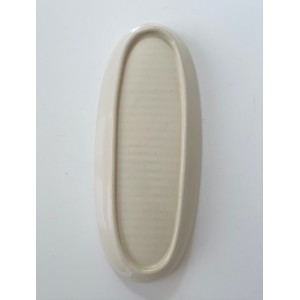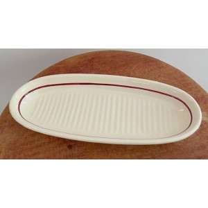 Porte savon, Coupelle ovale creuse à rainures en céramique de coloris blanc cassé avec liseré bordeaux.
