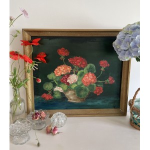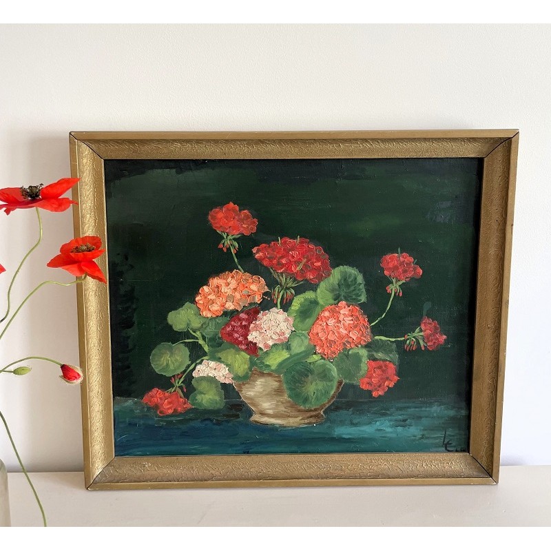Grand tableau avec nature morte de 1965 représentant des géraniums dans un pot de fleurs. Signature en bas à droite.