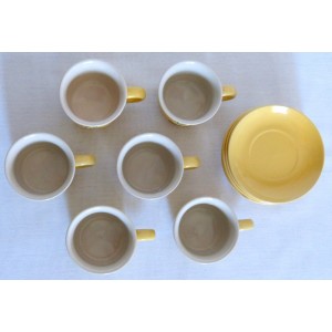 Tasses et soucoupes coloris jaune, décor coloris noir.
