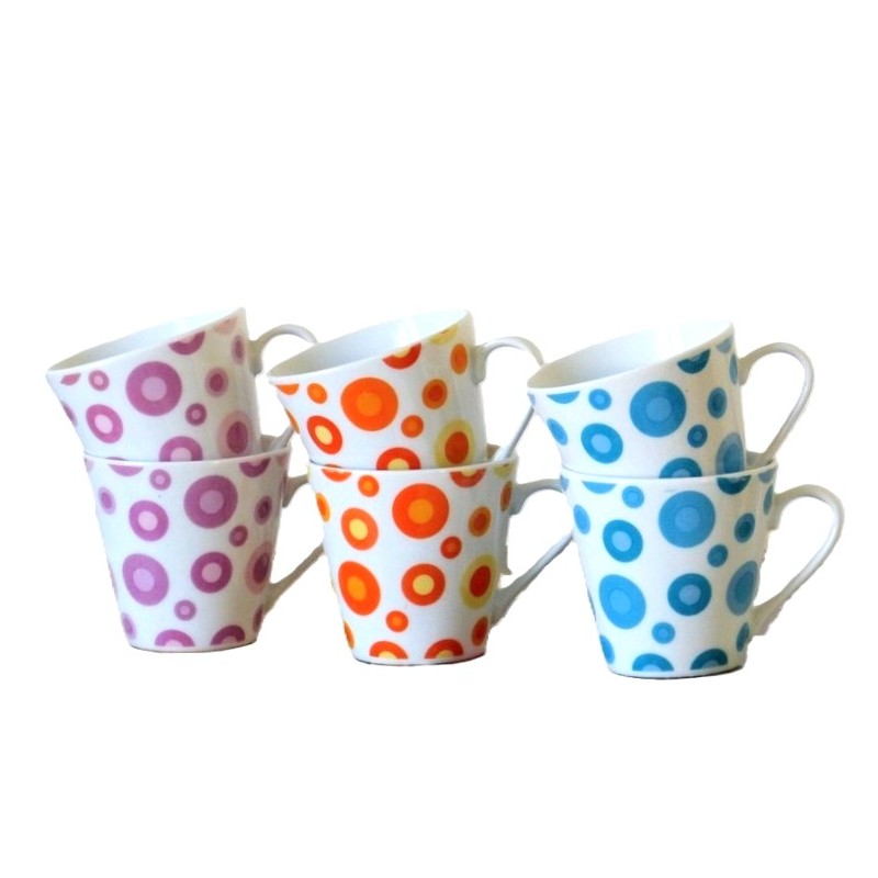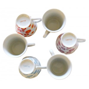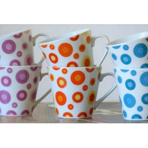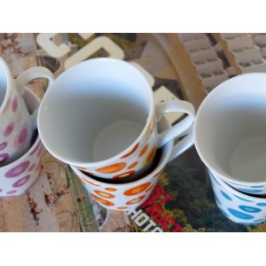 2 tasses pois bleus, 2 tasses pois oranges/jaunes, 2 tasses pois roses/mauves.