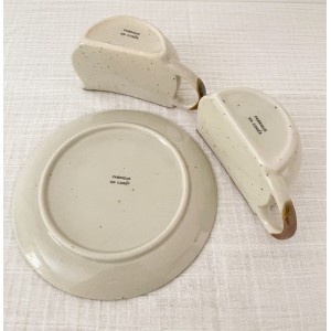 Ensemble de 3 pièces comprenant 2 tasses forme demi tasse avec une petite assiette soucoupe. Ensemble en grès avec motifs d'une bouche et une moustache sur les tasses et la soucoupe.
