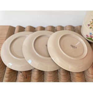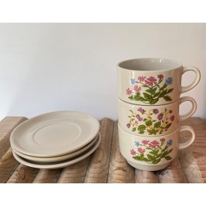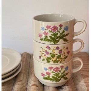 3 tasses soucoupes vintage en grès fleuri