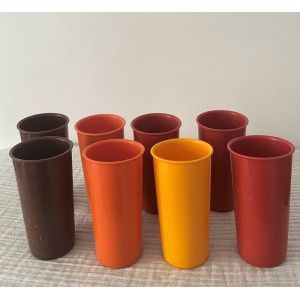 - 8 gobelets empilables, coloris : jaune, orange foncé, orange et marron. Dimensions : Hauteur 10,7 cm pour 5,5 cm de diamètre.