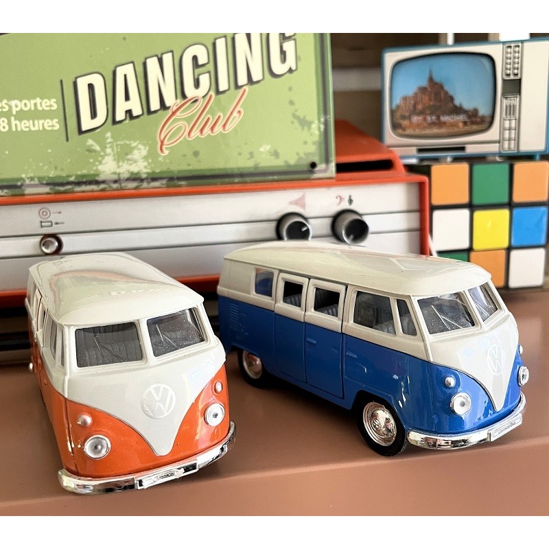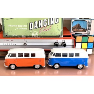 Voitures en métal et en plastique. Pneus en caoutchouc. Coloris : un Combi orange et blanc cassé. Un Combi bleu et blanc cassé.