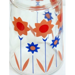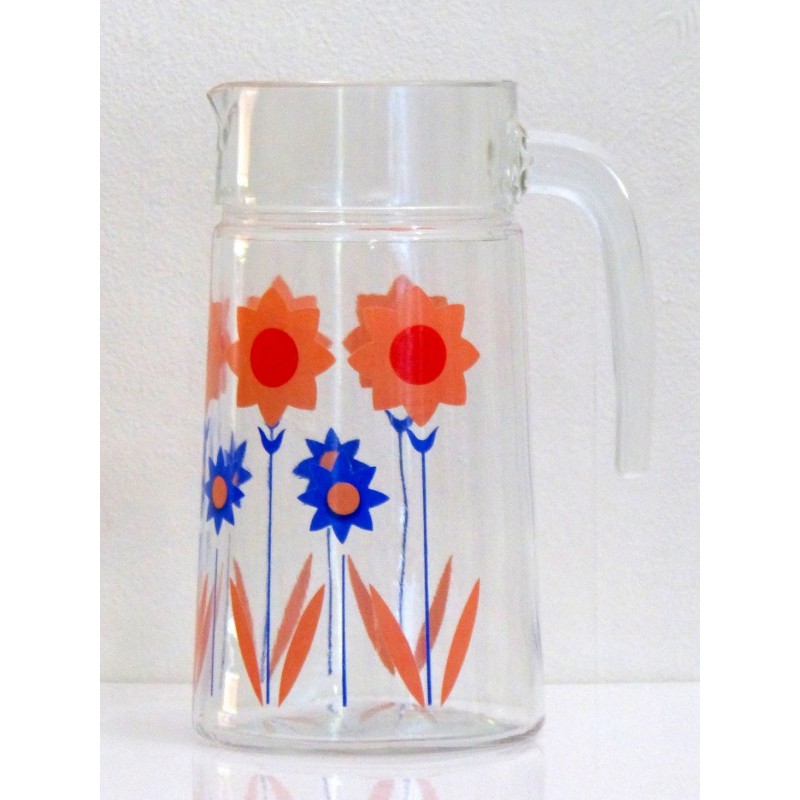 Pichet en verre. Décor de fleurs en rose, rouge et bleu.
