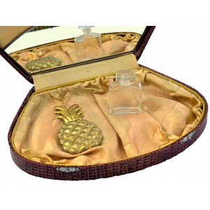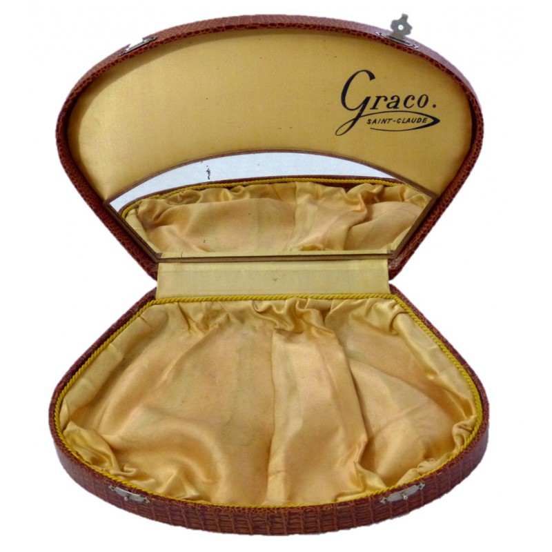 Boite cartonnage, imitation cuir marron. Intérieur tissu satiné avec galon jaune/or.