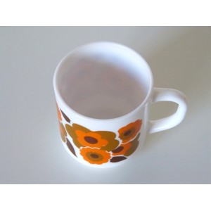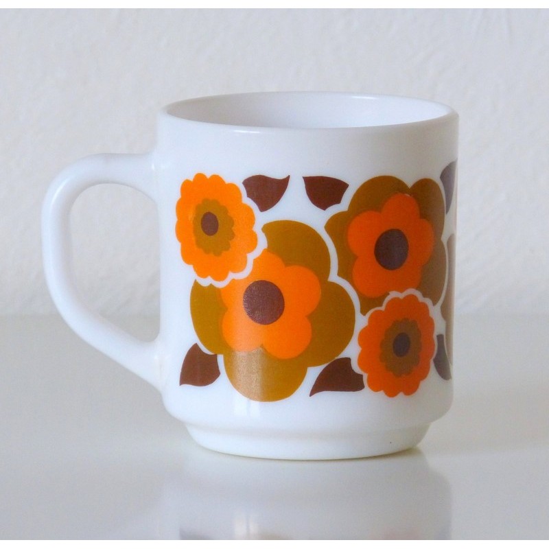 Mug en verre opale blanc aux motifs floraux de coloris orange et marron.