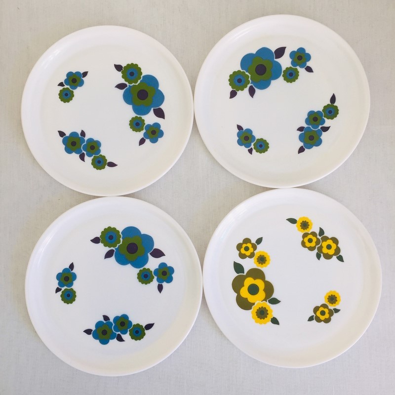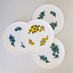 3 assiettes coloris fleurs : bleu/vert. 1 assiette coloris jaune/vert.