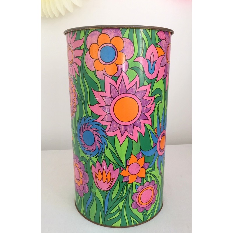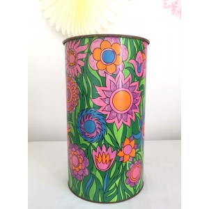Baril en tôle à décor de grandes fleurs et de feuillage colorés. Intérieur de coloris doré.