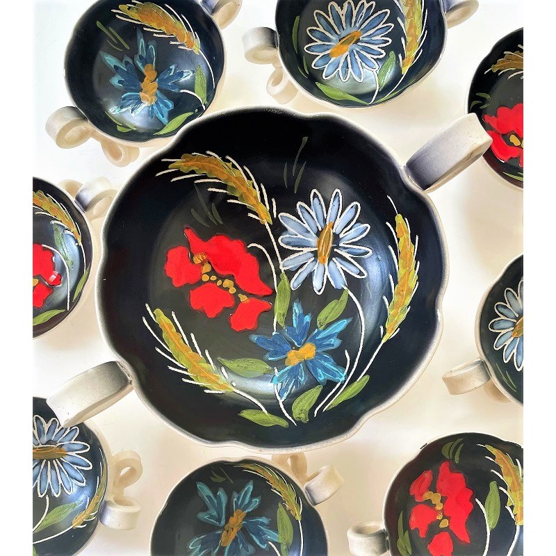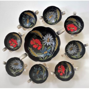 Coupe forme saladier et 8 coupelles en céramique blanche et noire émaillée. Décor de fleurs en relief et de blé colorés sur fond noir à l'intérieur de la coupe et des coupelles. Anses en forme de nœud.