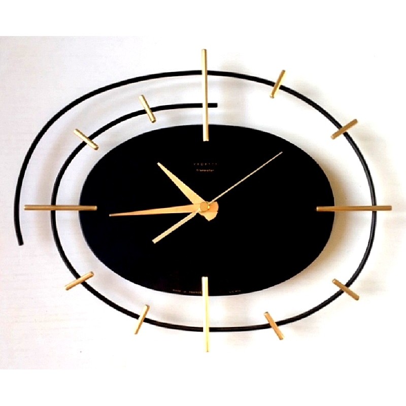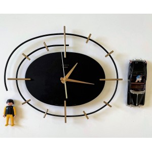 Pendule murale ovale en fer peint noir d'origine et en laiton doré. Aiguilles dauphines et trotteuses dorées. Signée Vedette Transistor, Made in France, LIC ATO. Design du logo ORTF de la première chaîne de TV française.