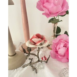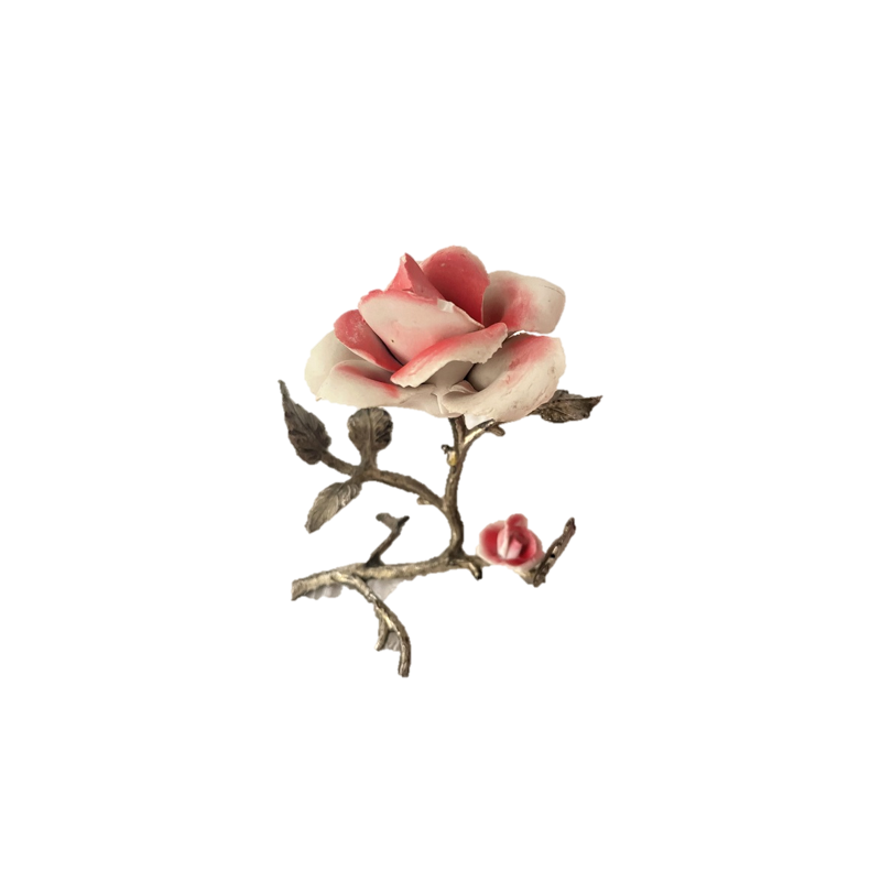 Deux roses en barbotine rose et blanche sur un pied en métal travaillé aspect vieilli en forme de branche avec 5 feuilles. (pas de poinçon).