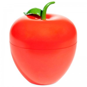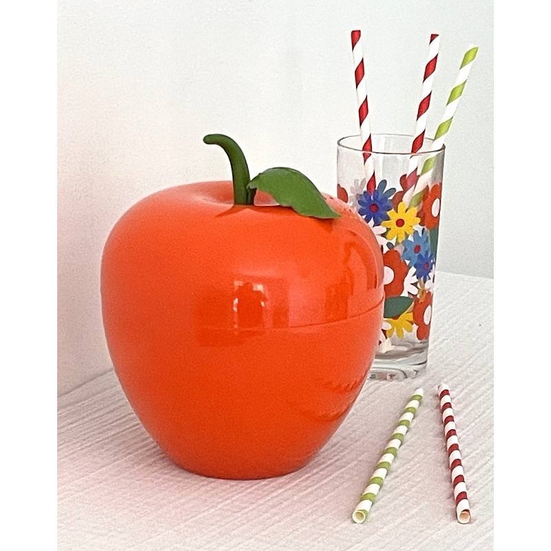 Seau à glaçons en plastique orange en forme de pomme, avec sa tige et sa feuille coloris vert.