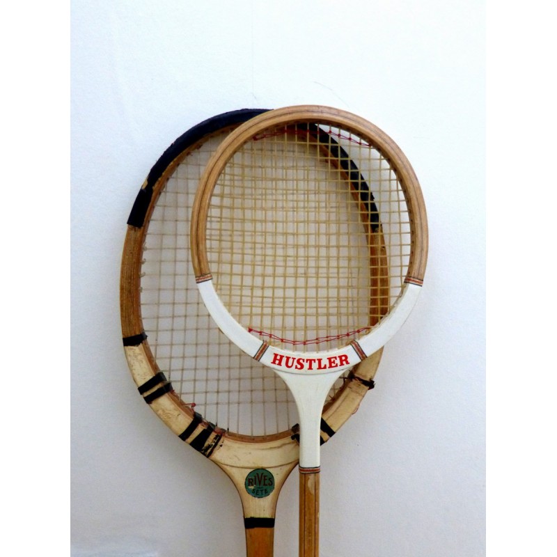 Deux raquettes en bois d’avant 60/70’s, avec cordages en boyaux, poignées et armatures en bois et cuir + 1 structure amovible en bois d’époque, avec vis à ailettes.